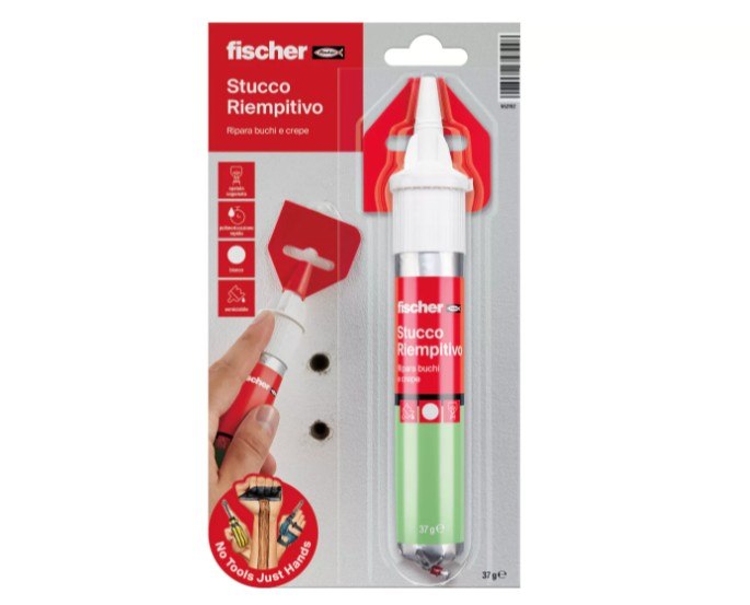 Stucco leggero rapido, in tubetto con spatola integrata, per coprire fori e crepe, finitura liscia, colore bianco.
